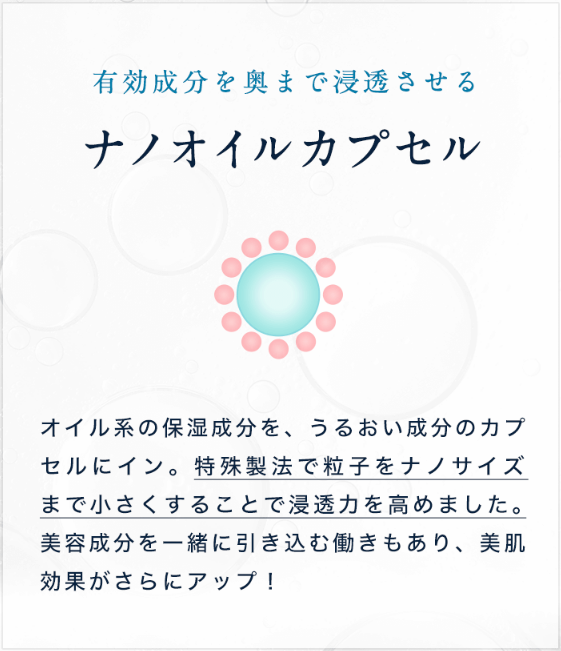 成分の浸透を目的としたナノサイズのカプセルと、保湿持続を目的とした球状ラメラカプセルを配合。水分と美容成分がしっかり浸透することで美肌効果が期待できます。